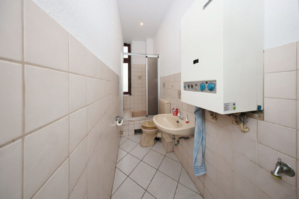 - Badezimmer 1: mit Dusche, WC, Fenster, Waschmaschinenanschluss und Gastherme.
