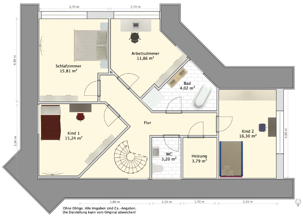 Eine massive Holztreppe führt ins Obergeschoss. Hier erwarten Sie vier individuell geschnittene Zimmer, die dank des besonderen Baustils ihren ganz eigenen Charme versprühen. Ob Schlaf-, Kinder-, Gäste- oder Arbeitszimmer die Nutzungsmöglichkeiten sind sehr vielfältig. Zusätzlich finden Sie auf dieser Ebene ein großes, helles Badezimmer mit Wanne und Dusche, ein separates WC sowie die Heizungsanlage. Ein Dachboden bietet weiteren praktischen Stauraum.