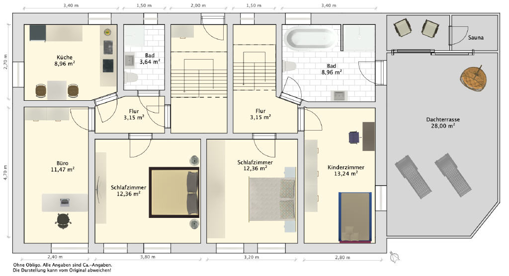 Bereits beim Betreten spürt man die Großzügigkeit und den besonderen Charme dieses Hauses. Das Erdgeschoss bietet mit 5 hellen Zimmern, einer erst zwei Jahre alten, hochmodernen Küche sowie einem stilvollen Bad mit ebenerdiger Dusche und WC ein Raumangebot, das kaum Wünsche offenlässt. Der HWR führt direkt hinaus auf die nicht einsehbare Terrasse ein Ort für entspannte Stunden im Freien. Auch das Wohnzimmer überzeugt mit seinem behaglichen Kaminofen und einem direkten Zugang in den grünen Außenbereich. Die elegante Treppe mit ihrem edlen Geländer aus Aluminium führt ins OG, wo ein offener Flurbereich, zwei weitere Zimmer und ein lichtdurchflutetes Bad mit Badewanne, Dusche und WC die neuen Bewohner erwartet. Ein absolutes Highlight ist der Zugang über das Badezimmer zur großzügigen Dachterrasse eine wahre Wohlfühloase mit Sauna und herrlichem Weitblick.
