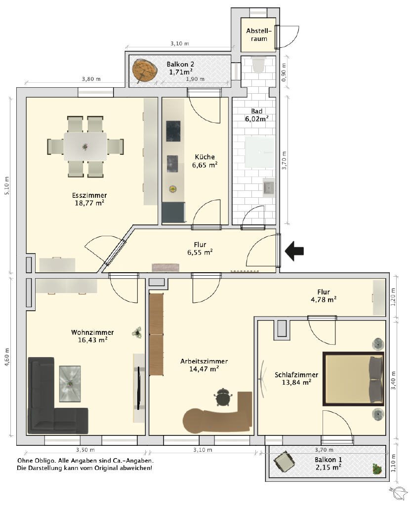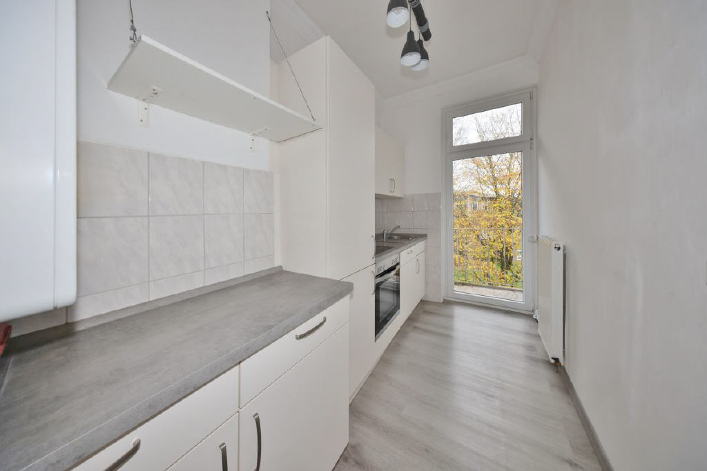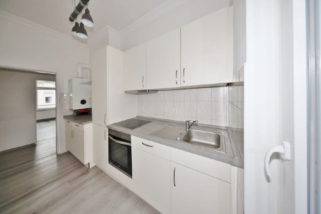 Die Räume wirken hell, klar proportioniert und bieten vielseitige Nutzungsmöglichkeiten. Ein besonderes Merkmal der Wohnung sind die beiden Balkone: Der Ost-Balkon an der Küche mit Blick zur grünen Rückseite des Hauses und der bis zum Abend sonnige West-Balkon am Wohnzimmer mit Blick auf die Straßenfassade.