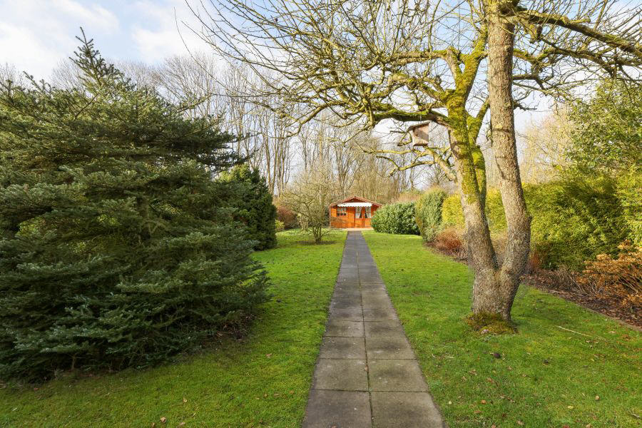 Der weitläufige und gepflegte Garten lädt zu ruhigen Stunden und geselligen Grillabenden ein. Ein großes Holzgartenhaus bietet praktischen Stauraum.