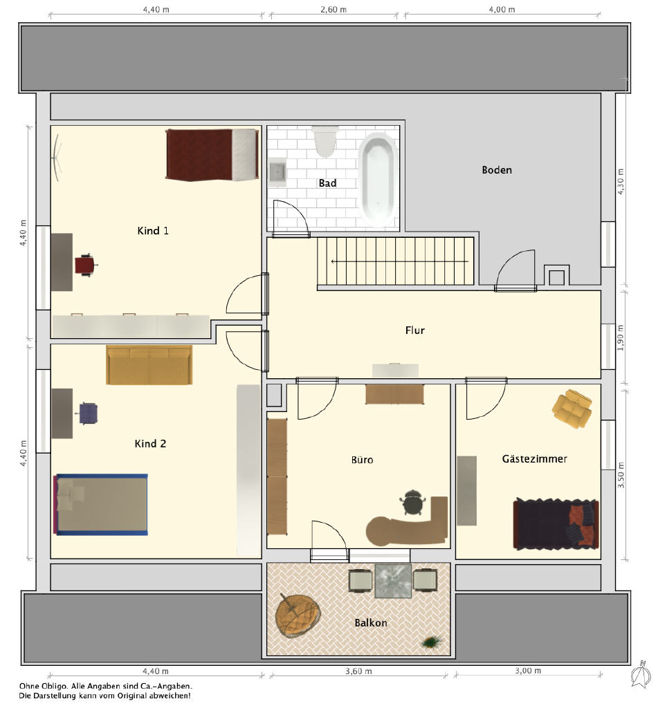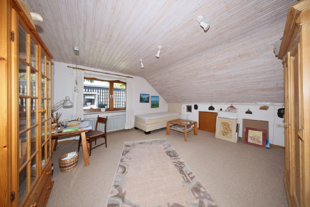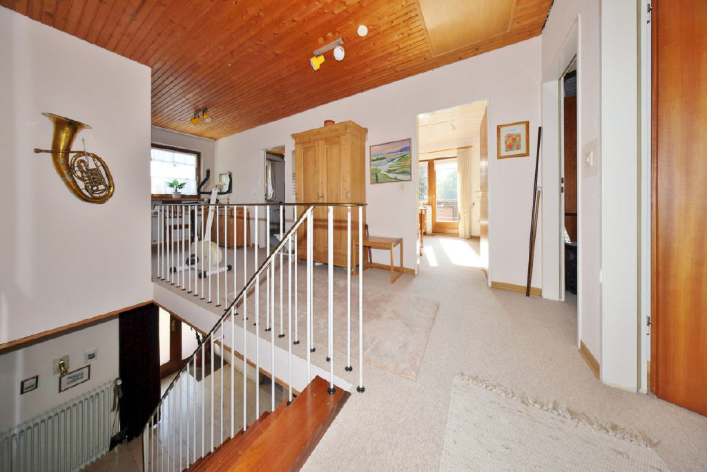 Über die offene Treppe gelangen Sie ins Obergeschoss mit fünf weiteren Zimmern sowie einem zweiten Badezimmer mit Dusche und WC. Ein Zimmer verfügt über einen Balkon mit Blick in den grünen Garten der perfekte Rückzugsort für ruhige Stunden. Der Dachboden bietet Stauraum und Abstellmöglichkeiten.