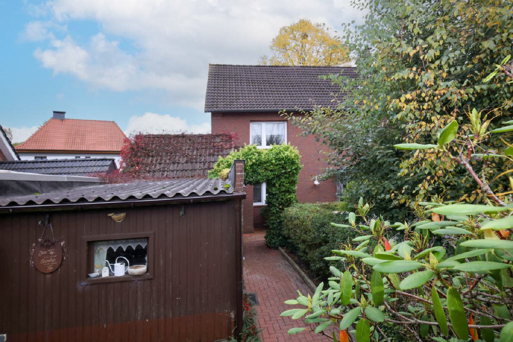 Außenbereich: Über einen begrünten Weg gelangen Sie zum Eingang des Hauses. Der liebevoll angelegte Garten bietet vielfältige Gestaltungsmöglichkeiten, ist schön eingewachsen und lädt mit idyllischen Sitzplätzen zum Verweilen ein. Neben einer Garage mit direktem Zugang in den Garten stehen zudem praktische Nebengebäude zur Verfügung, die ideal für Hobby, Werkstatt oder Gartengeräte nützlich sind.