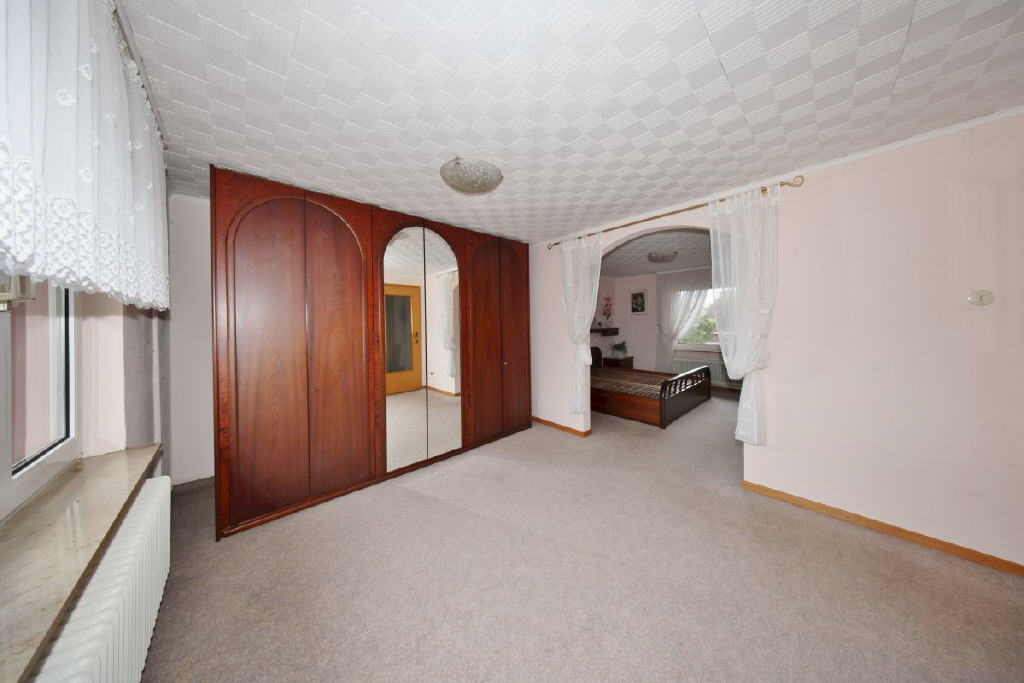 Über die geschwungene Treppe im Flur gelangen Sie in das Obergeschoss. Hier befinden sich drei weitere Zimmer sowie ein zweites Bad mit Dusche und WC. Besonders hervorzuheben ist das großzügige Schlafzimmer: Aufgrund des Durchbruchs wurde es in zwei Bereiche gegliedert perfekt für die Einrichtung eines Ankleidezimmers oder eines Rückzugsbereiches.