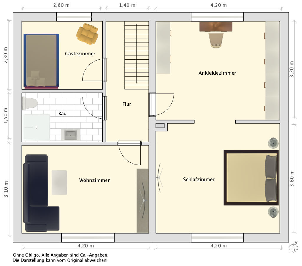 Im ausgebauten Dachgeschoss steht ein weiteres Zimmer zur Verfügung, das sich ideal als Gäste- Arbeits- oder Hobbyraum eignet. Zudem bietet auf dieser Ebene der Dachboden zusätzliche Abstellmöglichkeiten.