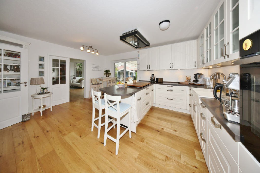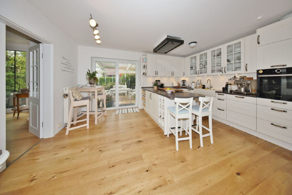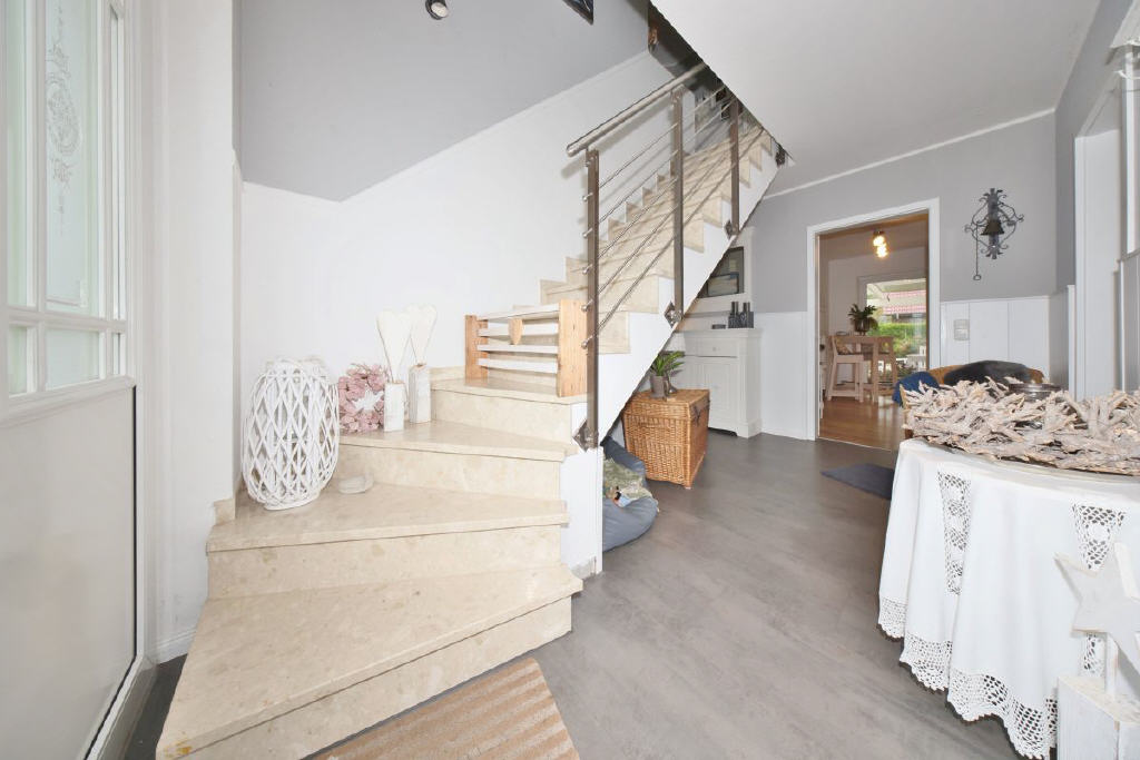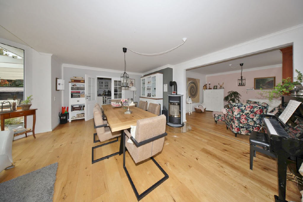 Das im Jahr 2002 erbaute Klinkerhaus steht auf einem großzügigen Grundstück von rund 780 m² und wurde 2020 nahezu komplett modernisiert. Schon beim Betreten spürt man die warme, einladende Atmosphäre, die dieses Haus ausstrahlt. Die helle, großzügige Diele öffnet sich zum Herzstück des Hauses: dem beeindruckenden Wohn- u. Essbereich. Große Fensterflächen lassen den Blick frei auf den gepflegten Garten, während der Kaminofen an kühleren Tagen für wohlige Wärme sorgt. Besonders das Panoramafenster im Erker mit Zugang in den herrlichen Garten verleiht dem Raum eine besondere Tiefe. Von der angrenzenden ca. 22 m² großen freundlich-hellen Küche aus gelangen Sie direkt auf die teilüberdachte Terrasse mit Glasdach. Im Erdgeschoss befindet sich zudem ein hübsches Duschbad sowie ein praktischer Hauswirtschaftsraum mit Zugang zur Garage.