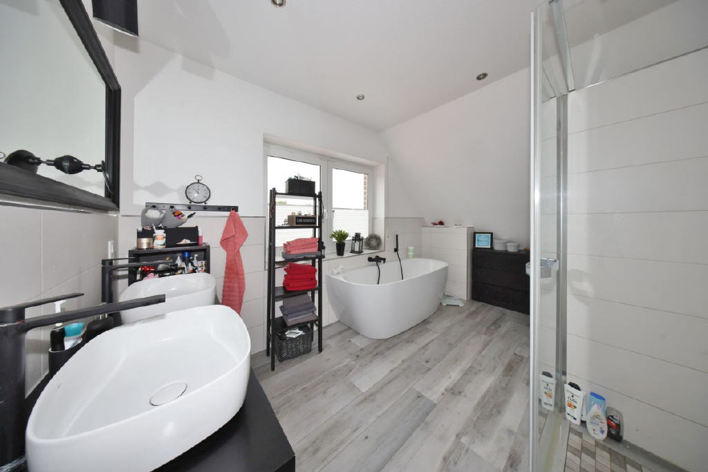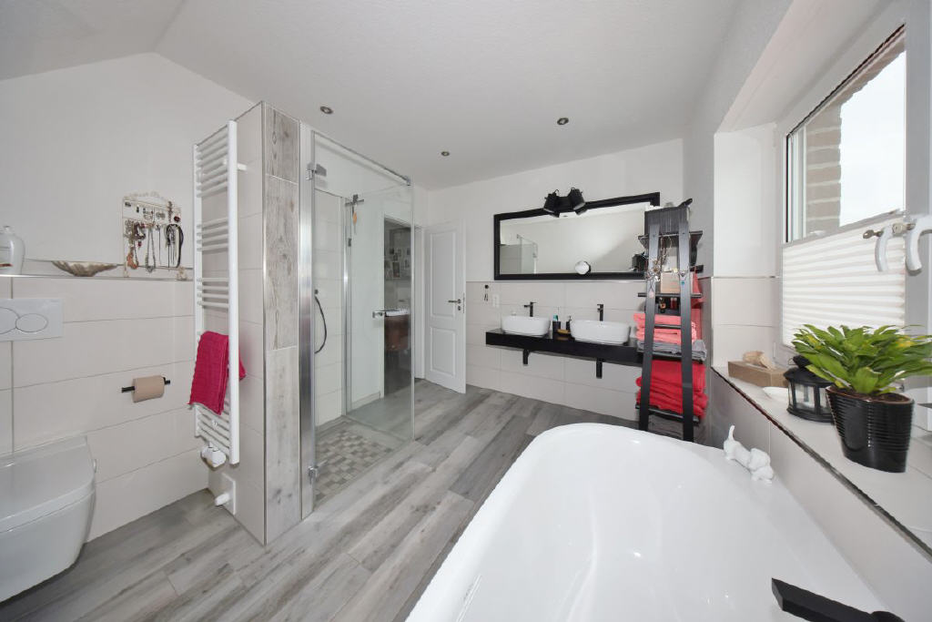 Über die edle Steintreppe gelangen Sie in das Obergeschoss, das mit vier hellen und großzügigen Zimmern begeistert. Ein kleiner Raum wird aktuell als begehbarer Kleiderschrank genutzt. Das geschmackvolle Tageslicht-Badezimmer mit Badewanne, bodengleicher Dusche, zwei Waschbecken und WC vermittelt sofort ein Spa-Feeling im Alltag. Eine weitere Treppe führt in das ausgebaute Dachgeschoss, das flexibel nutzbar ist ob als Gästezimmer, Büro oder Hobbybereich.