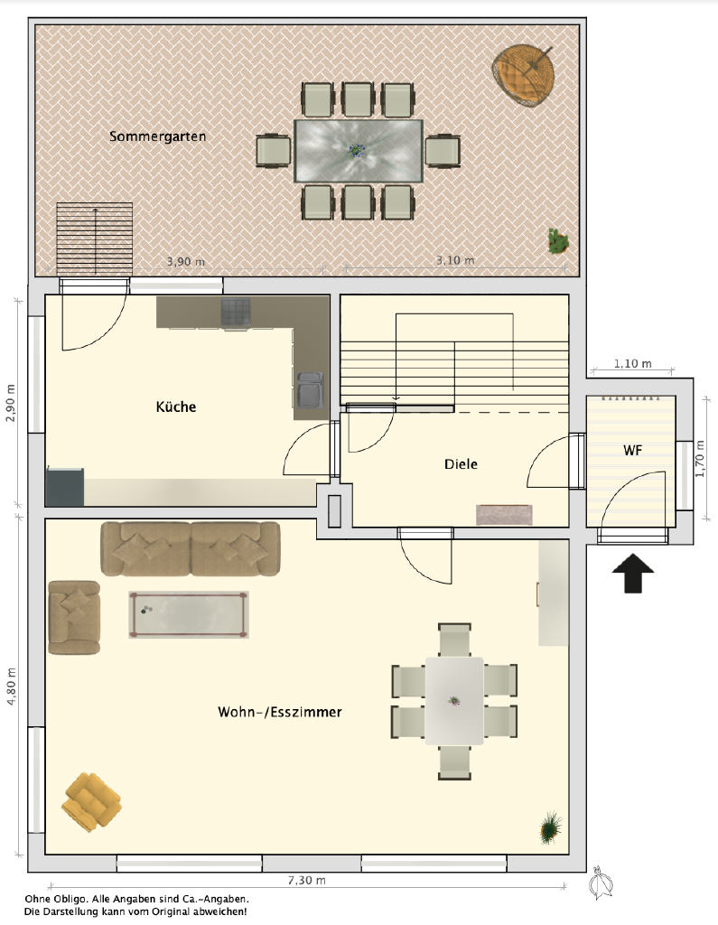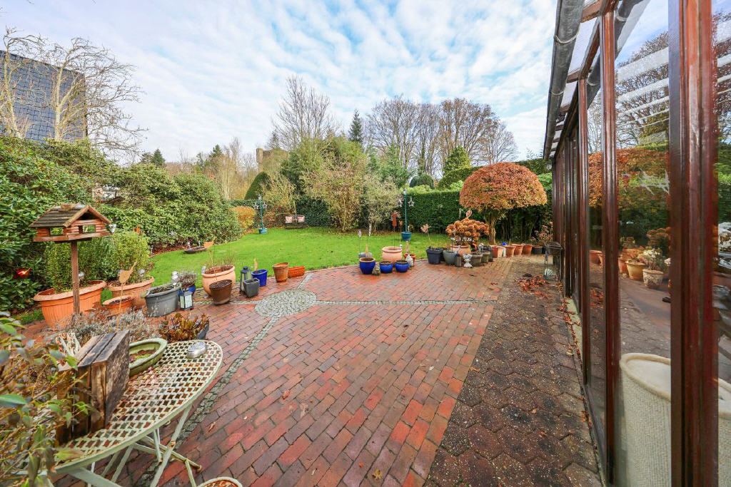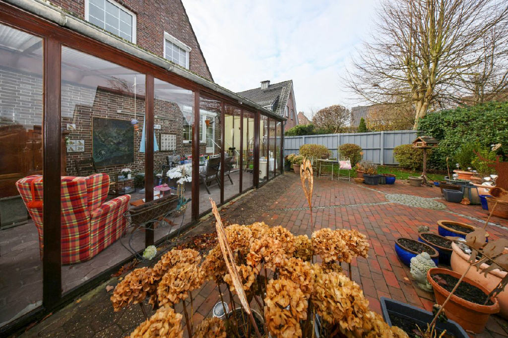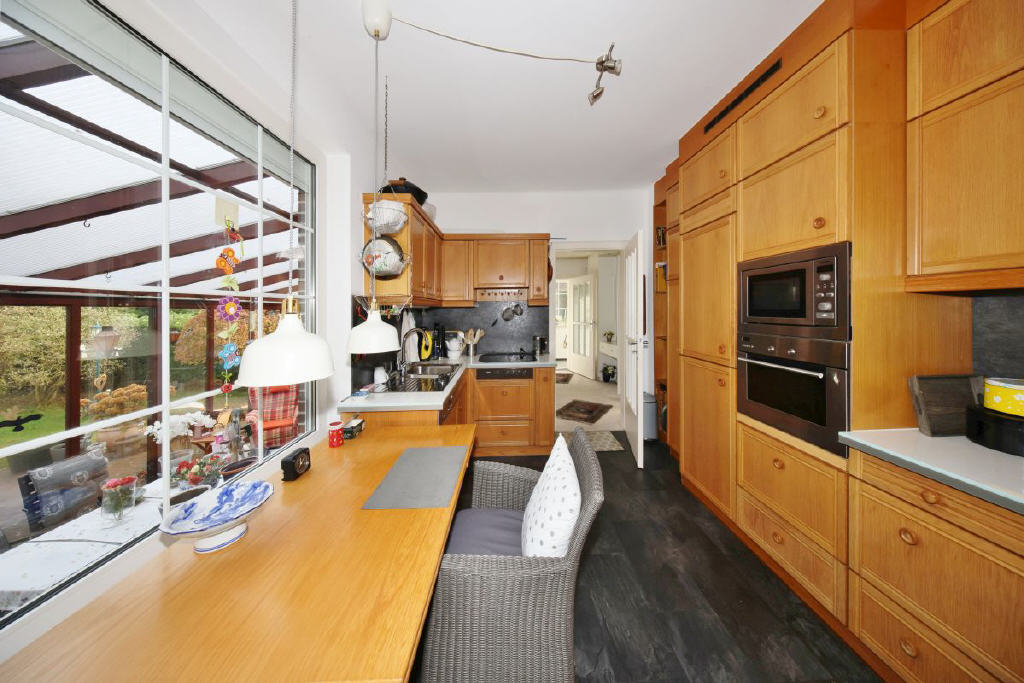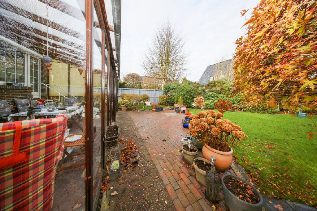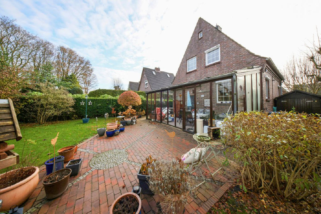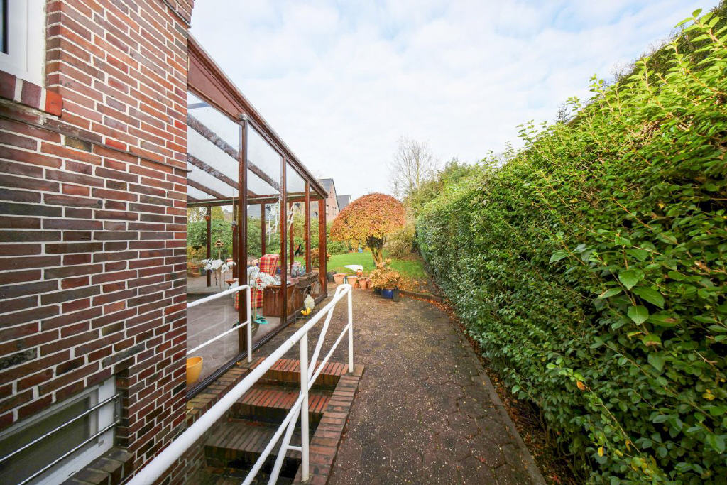 Das Grundstück umfasst 539 m² und öffnet sich mit einem gepflegten Vorgarten und einem kleinen Weg, der über ein paar Stufen zum geschützten Eingang mit Windfang und Garderobe führt. Eine Tür mit Glaseinsätzen führt in die beeindruckende Diele ein Bereich, der dem Haus seinen besonderen Charakter verleiht. Von hier aus gelangt man in die anliegenden Räume: Das Wohnzimmer begeistert durch seine angenehme Großzügigkeit, weite Fensterflächen und den Blick ins Grüne. Ebenso einladend ist die Küche, deren große Fensterfront den Garten fast in das Haus hineinholt. Von hier aus öffnet sich der Zugang in den Sommergarten, der 1986 angebaut wurde mit ca. 29 m² ein echtes Highlight. Lichtdurchflutet, wohnlich und ideal für gemütliche Stunden zu jeder Jahreszeit. Über den Sommergarten gelangen Sie stufenlos auf die Terrasse und in den herrlichen, nicht einsehbaren Garten.