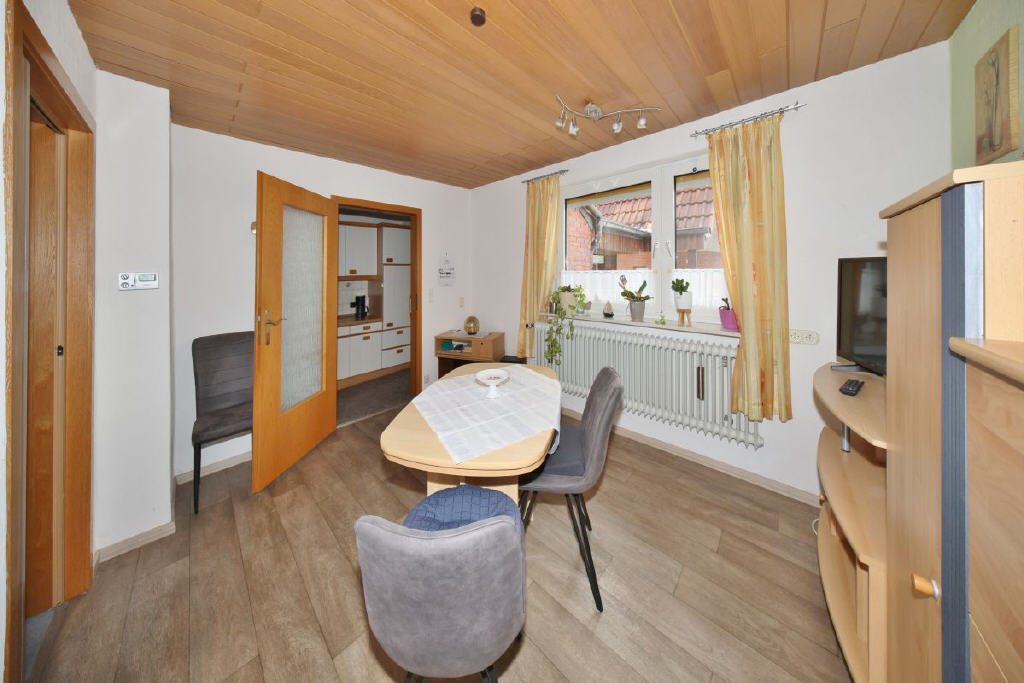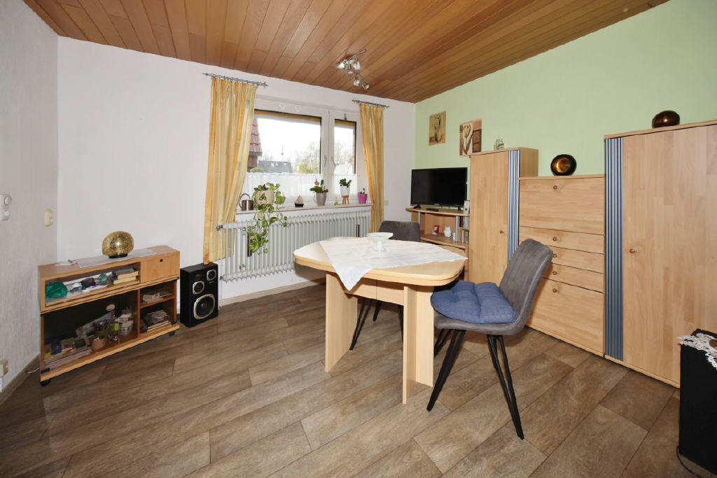 Auf einem großzügigen Grundstück von ca. 583 m² eröffnet sich hier ein Haus mit ca. 80 m² Wohnfläche und viel Raum für individuelle Gestaltungsideen. Im Erdgeschoss empfängt Sie ein zentraler Flur, von dem aus Sie direkt in die Küche gelangen. Diese ist mit einer funktionalen Einbauküche ausgestattet und bildet den Dreh- und Angelpunkt des Hauses. Von hier aus erschließt sich das angrenzende Esszimmer, das offen in das Wohnzimmer übergeht eine klassische und bewährte Raumstruktur mit angenehmer Wohnatmosphäre. Ebenfalls über die Küche erreichen Sie eine zusätzliche Diele. Von hier aus bestehen Zugänge zum Gäste-WC, zum Badezimmer sowie zu einer praktischen Abstellnische. Eine Tür führt direkt in den Gartenbereich und zum Nebengebäude, das sich ideal als Hobbyraum, Atelier oder Rückzugsort nutzen lässt. Die Terrasse ist mit einer elektrischen Markise ausgestattet. Auf dem Hof steht eine Garage sowie zwei weitere Stellplätze zur Verfügung.