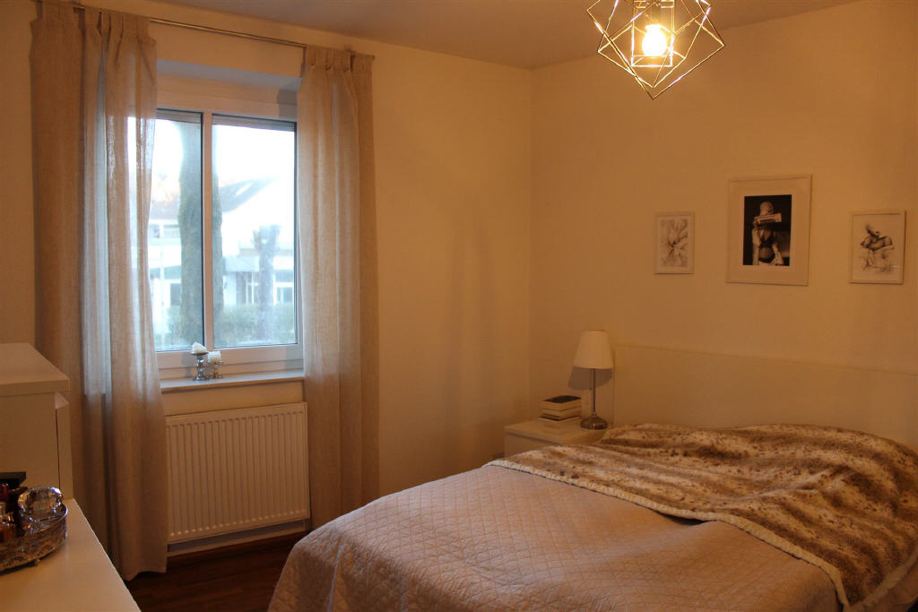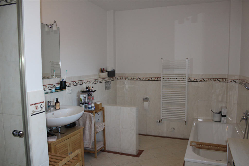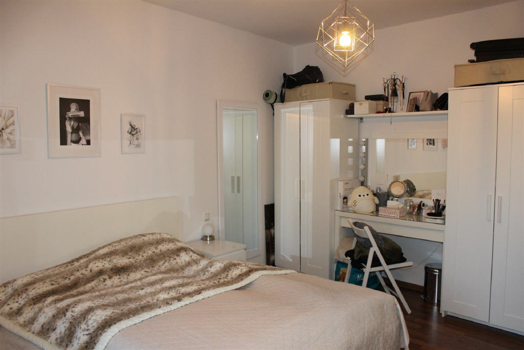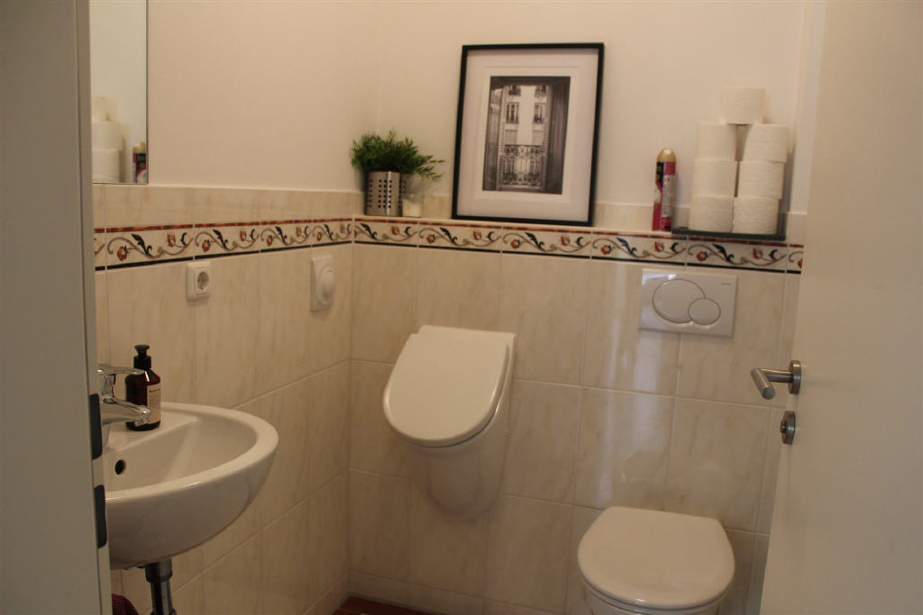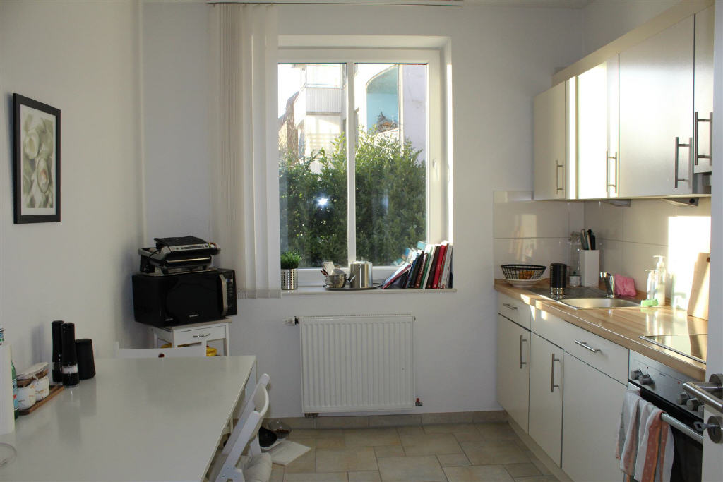 Die lichtdurchfluteten Räume schaffen ein angenehmes Wohngefühl aufgrund der Bodenbelege in warmen Farbtönnen. Wohn- und Schlafzimmer sind mit modernem Laminat ausgestattet, während Flur, Küche, Bad und Gäste-WC mit hellen, beigefarbenen Fliesen versehen sind. Die gesamte Wohnung ist weiß gestrichen und bietet viel Platz. Zu der Mietwohnung gehört außerdem ein Kellerraum.