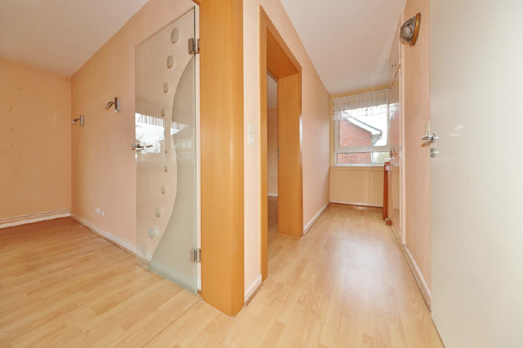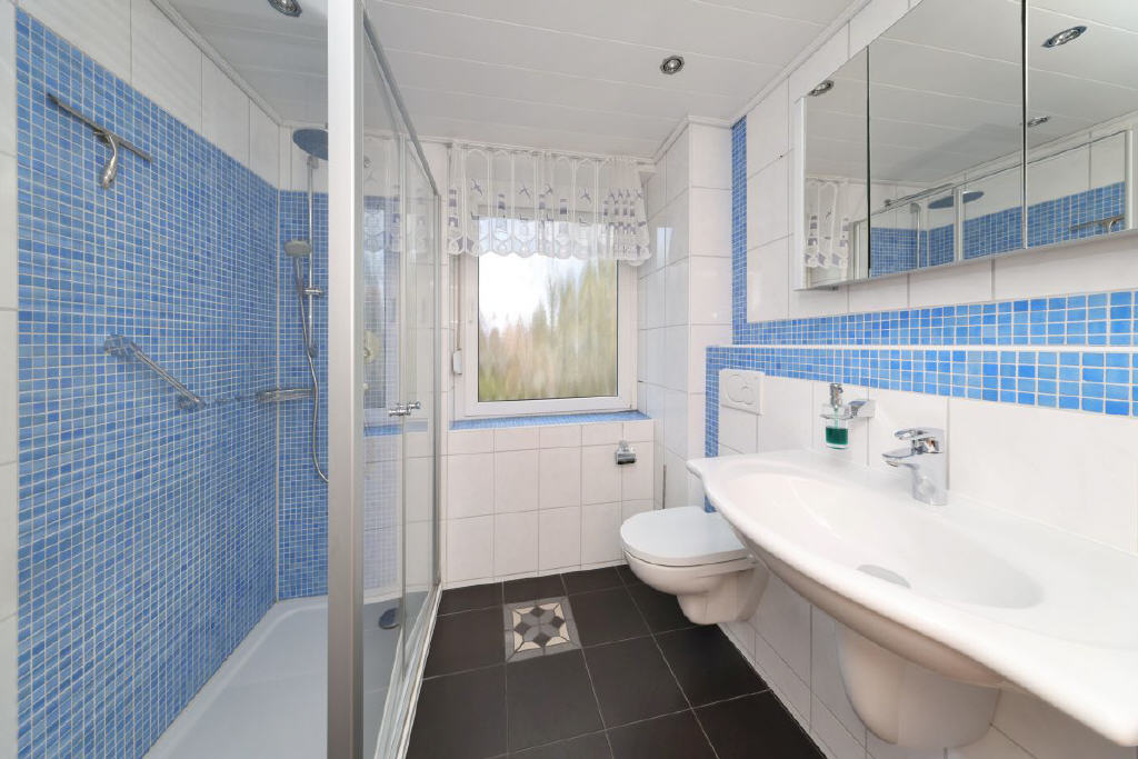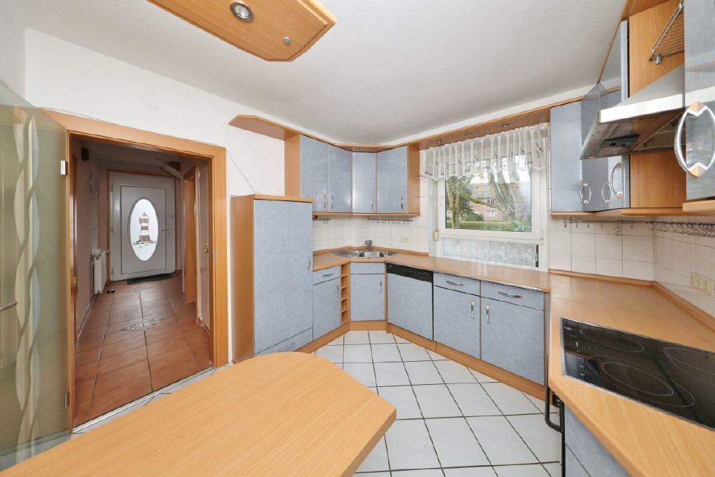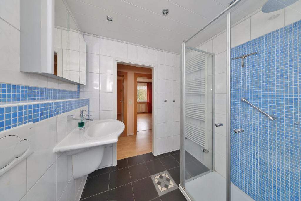 Die Küche präsentiert sich großzügig und ist mit einer Einbauküche ausgestattet. Ergänzt wird das Raumangebot im Erdgeschoss durch ein helles und ansprechendes Bad mit Dusche und WC.