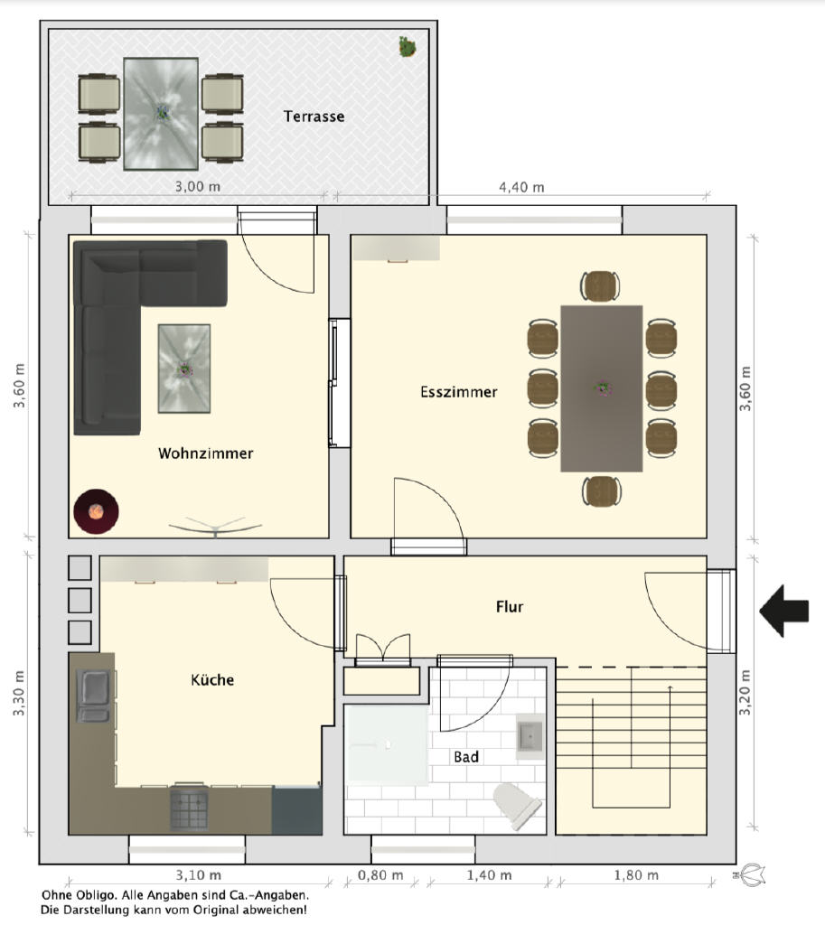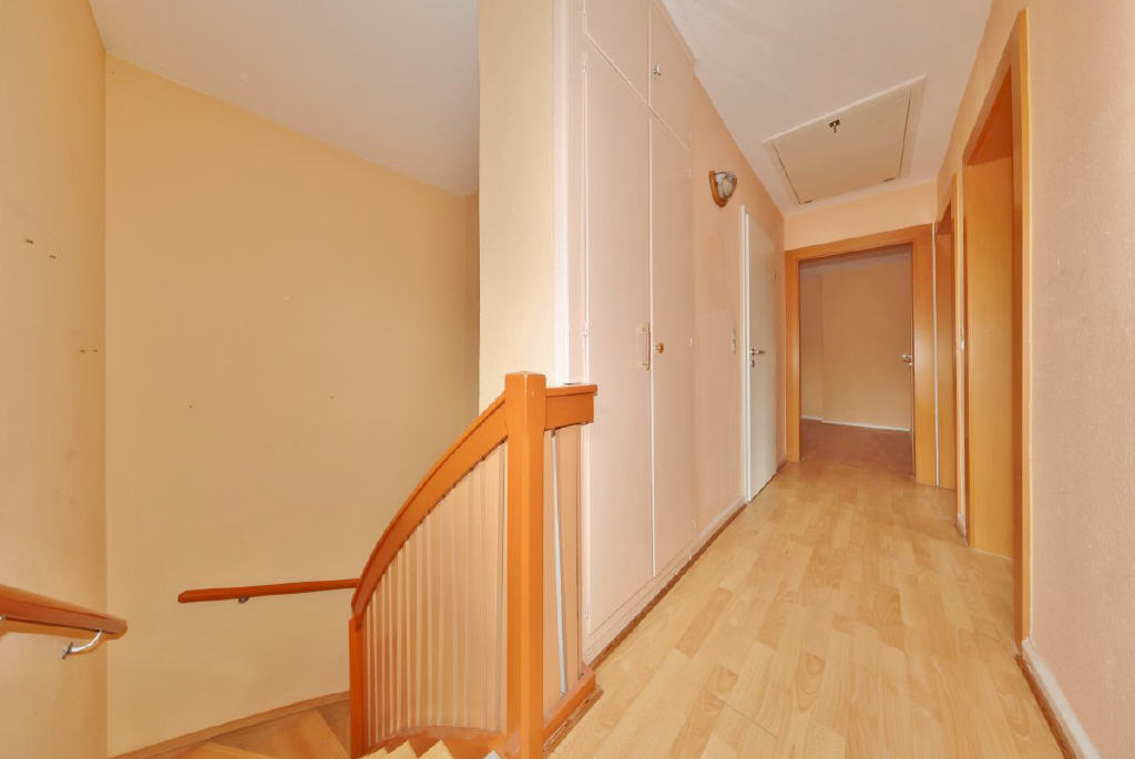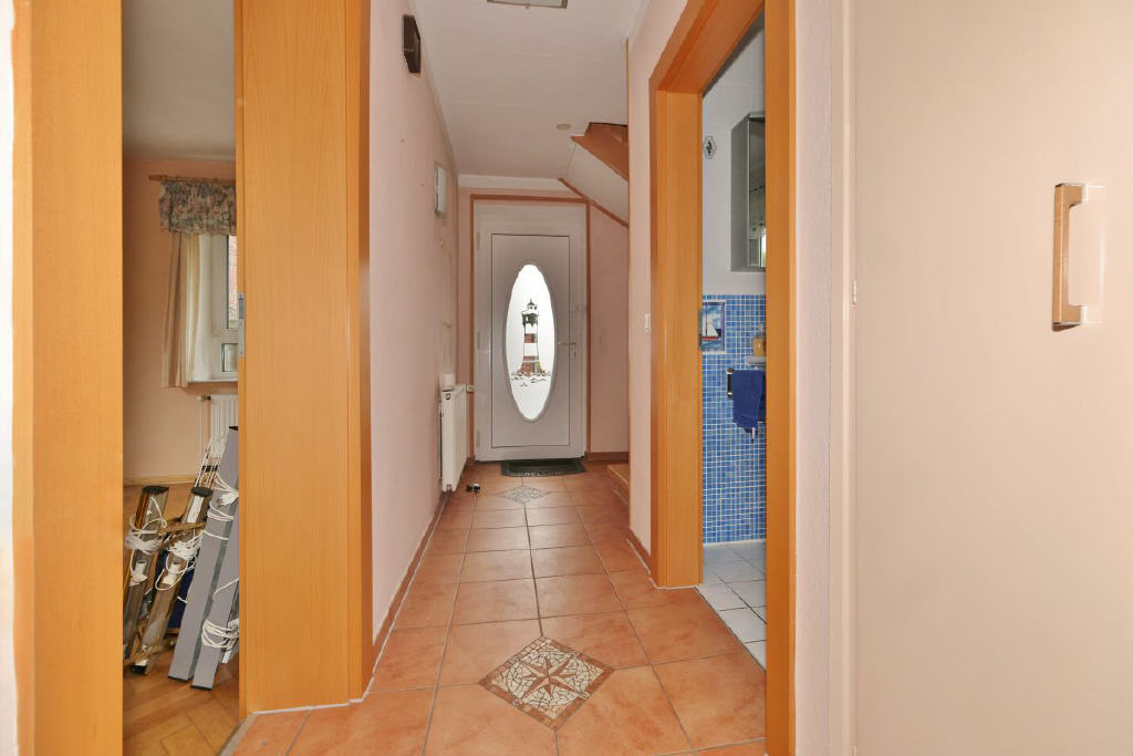 Bereits der Zugang über wenige Stufen und den überdachten Eingangsbereich vermittelt einen gepflegten ersten Eindruck. Im Inneren empfängt Sie ein freundlicher Flur, geprägt von warmen Farbtönen und stilvollen Glastüren, die dem Haus eine angenehme Wohnatmosphäre verleihen. Die offenen Treppen zum Keller und in das Obergeschoss verleihen dem Flur einen großzügigen Charakter. Alle Fenster des Hauses sind mit Außenrollläden ausgestattet.