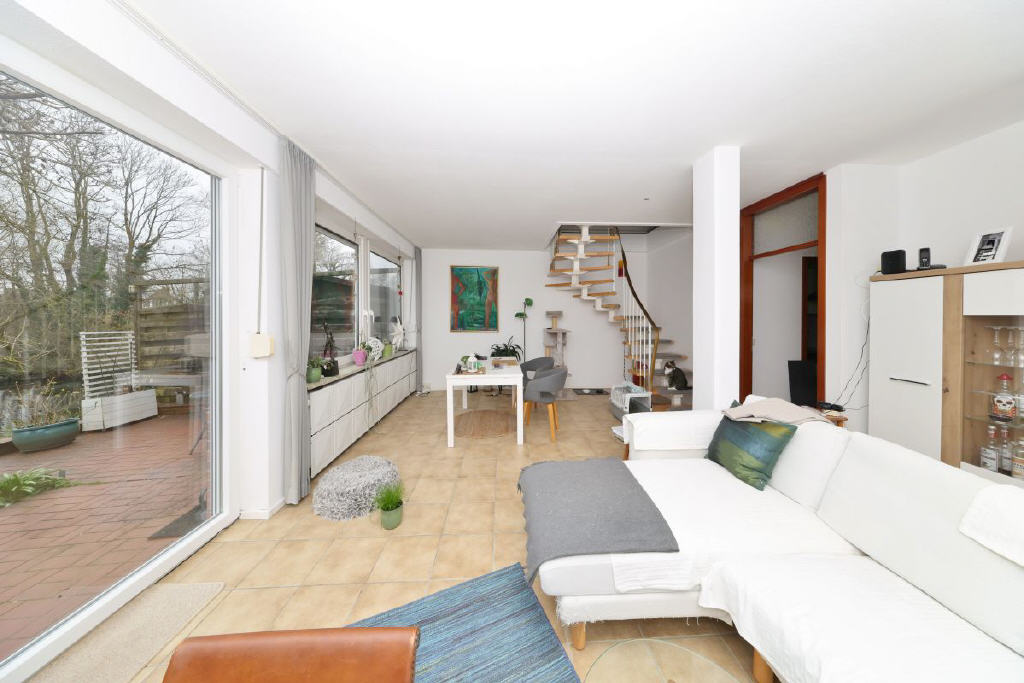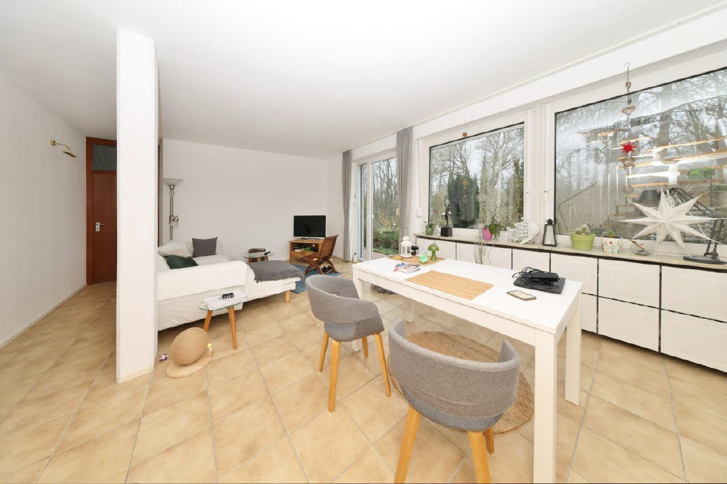 Das Herzstück des Hauses ist der großzügige Wohn- und Essbereich im Erdgeschoss. Lichtdurchflutet und offen gestaltet, verbindet er Innen und Außen auf harmonische Weise. Der direkte Zugang zur Terrasse und in den liebevoll eingewachsenen Garten lässt die Grenzen verschwimmen und schafft ein angenehmes Wohngefühl.