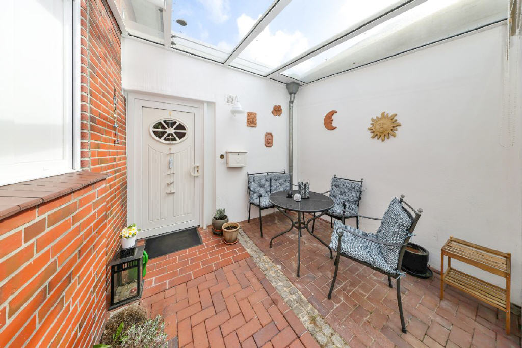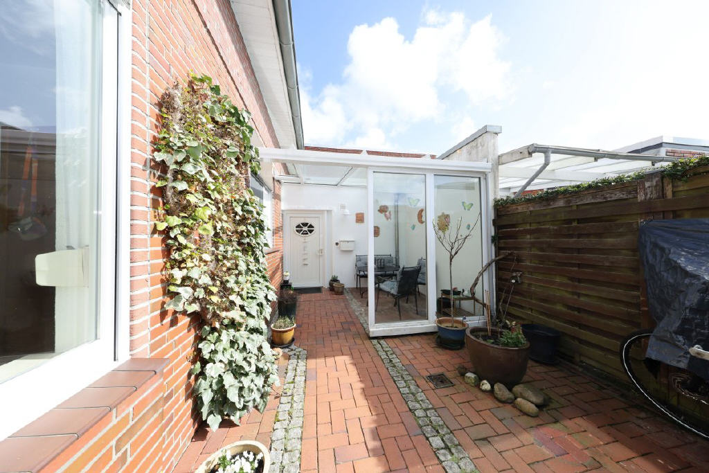 Der Außenbereich ist ein echtes Highlight: Der geschützte Garten, eingebettet zwischen Haus und Wasser, wirkt wie eine kleine private Oase. Mehrere Terrassen und Sitzplätze darunter ein Platz direkt am Wasser laden zum Verweilen ein.