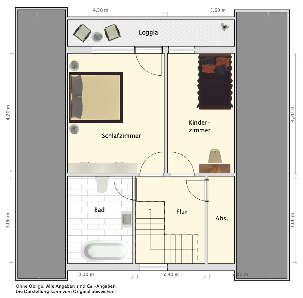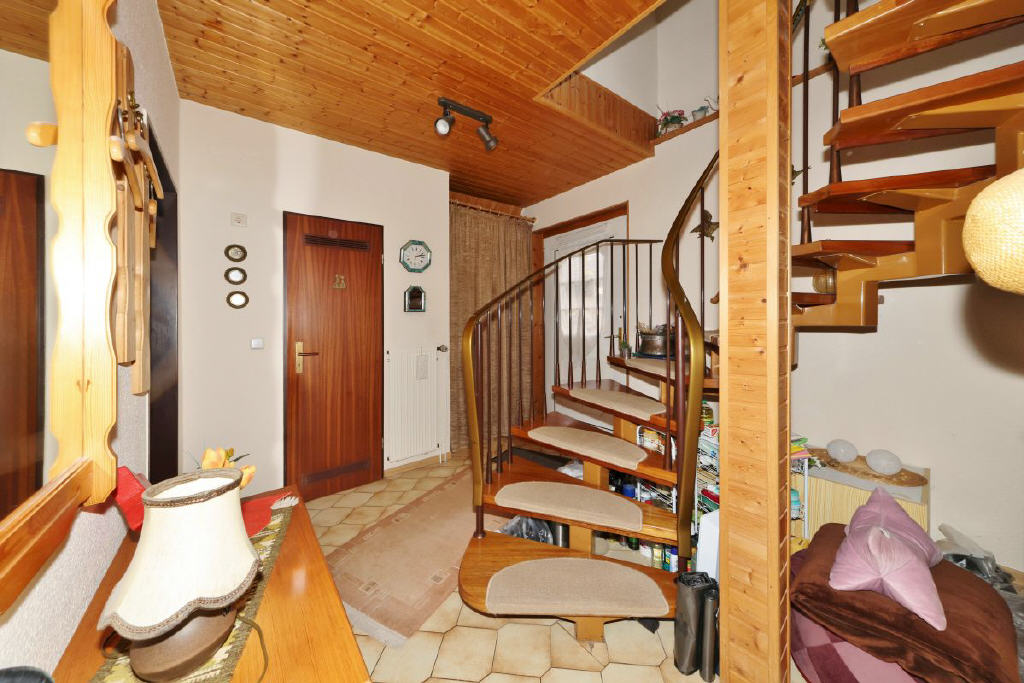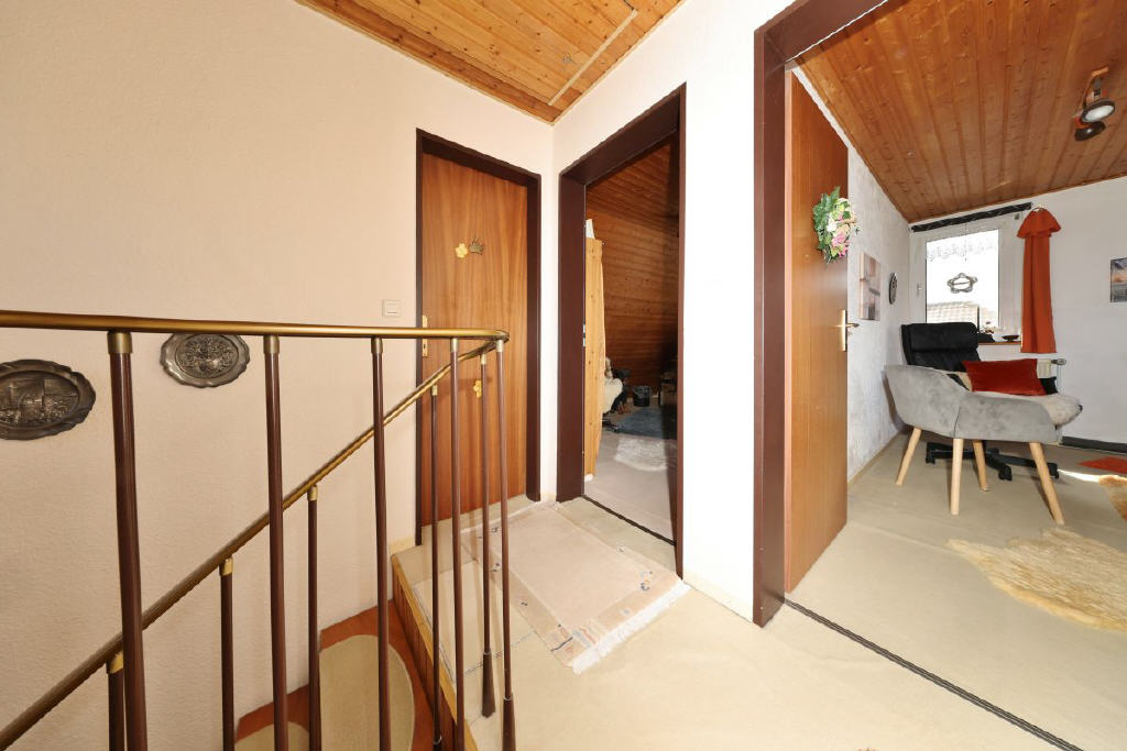 Über eine offene Wendeltreppe gelangen Sie in das Obergeschoss. Hier stehen zwei weitere Zimmer zur Verfügung, die sich flexibel nutzen lassen. Eines der Zimmer bietet Zugang auf den Balkon, der ebenfalls mit einer Markise ausgestattet ist. Das Badezimmer ist mit einer Badewanne und WC ausgestattet. Zusätzlichen Stauraum bietet der Dachboden als auch eine praktische Abseite in Flur.