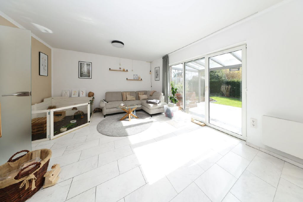 Das angrenzende Wohnzimmer präsentiert sich großzügig und lichtdurchflutet. Eine große Fensterfront mit Schiebetür schafft einen fließenden Übergang zur Terrasse und in den Garten. Der moderne Kaminofen ergänzt den Wohnbereich um eine behagliche Wärmequelle und sorgt insbesondere in den kühleren Monaten für eine angenehme Atmosphäre. Alle Fenster des Hauses sind mit elektrischen Außenrollläden ausgestattet.