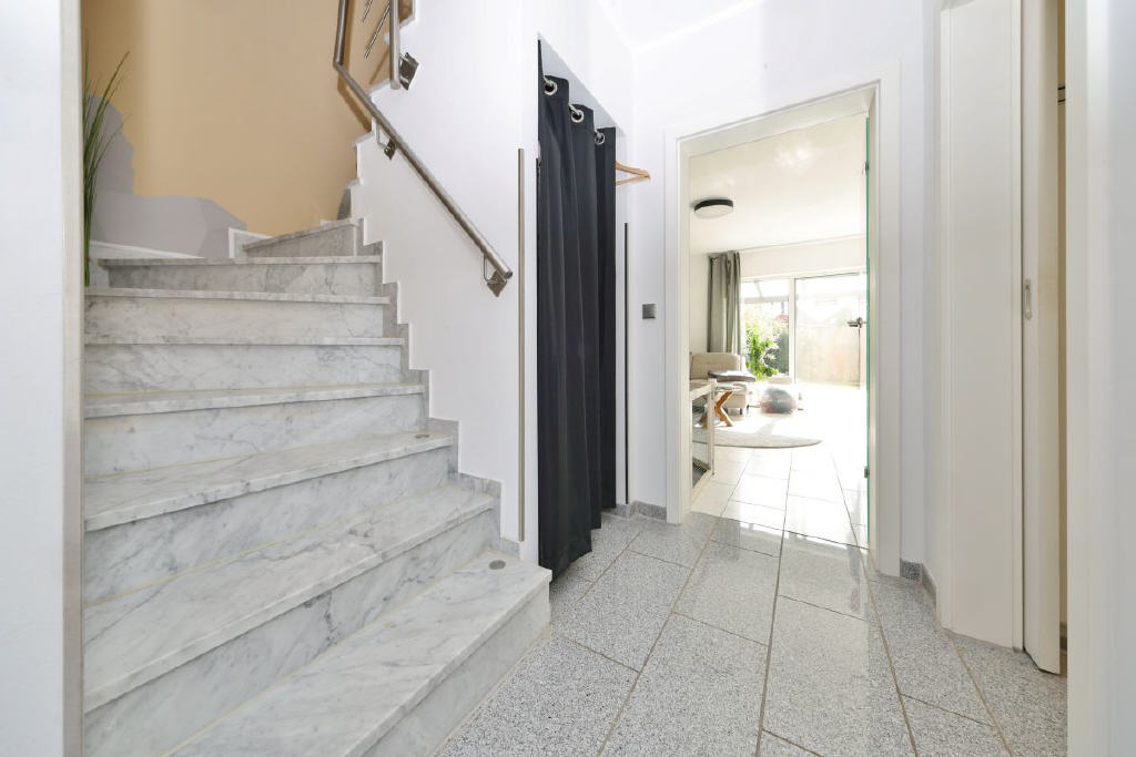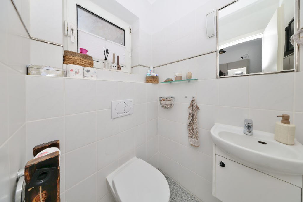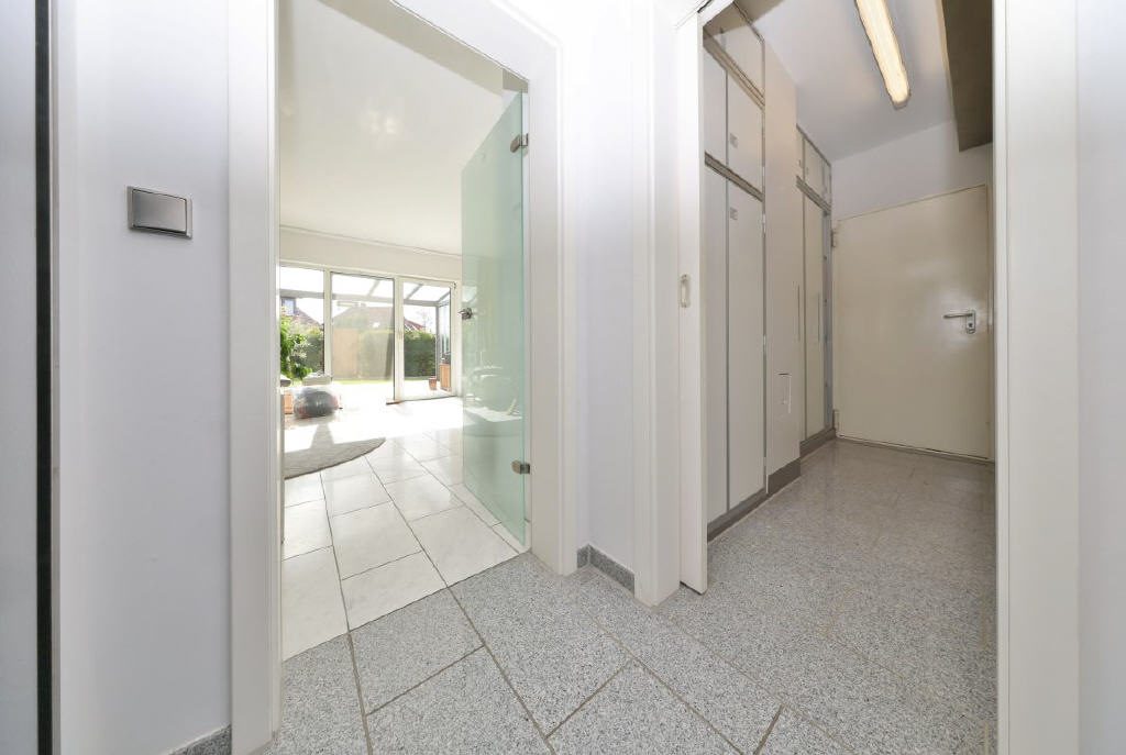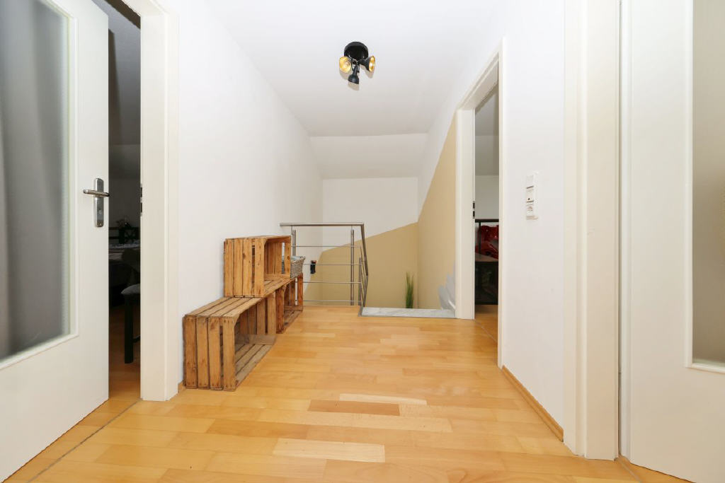 Im Erdgeschoss steht zudem ein Gäste-WC zur Verfügung. Ein praktischer Flur mit beidseitigen Einbauschränken bietet außergewöhnlich viel Stauraum und führt direkt in die große Garage, die gleichzeitig auch als Hauswirtschaftsbereich genutzt wird.