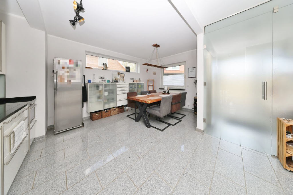 Bereits beim Betreten des Hauses wird die klare Struktur deutlich: Über den Windfang gelangen Sie durch eine satinierte Glastür direkt in den offenen Küchenbereich. Die moderne Einbauküche ist funktional gestaltet und bietet ausreichend Platz für einen gemütlichen Essbereich.