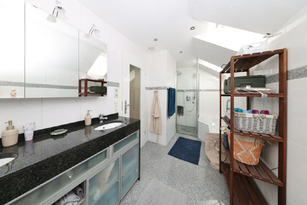 Im Obergeschoss befinden sich vier gut geschnittene Zimmer. Das Badezimmer ist hochwertig ausgestattet und verfügt über Dusche, Badewanne, WC und Bidet. Die fest installierte Waschtischanlage mit zwei Waschbecken, Granitoberfläche und großer Spiegelfront unterstreicht den gepflegten Gesamteindruck.