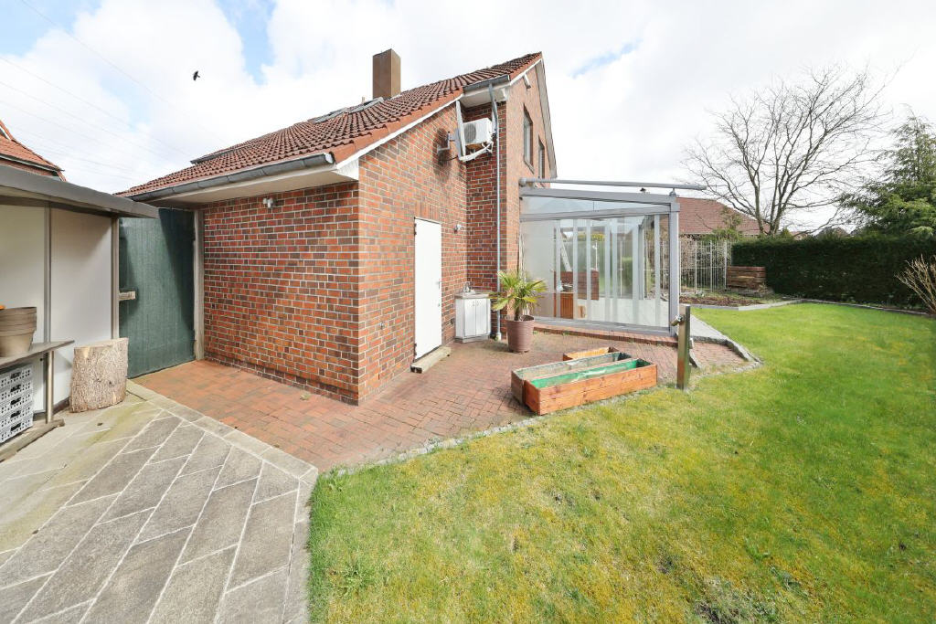 Der Außenbereich ist funktional und zugleich pflegeleicht angelegt. Neben der Garage stehen ein Carport sowie zwei weitere Stellplätze zur Verfügung. Die Terrasse ist mit Glaselementen eingefasst und durch eine elektrische Markise geschützt, wodurch sie nahezu witterungsunabhängig nutzbar ist. Ergänzend stehen mehrere Nebengebäude für Gartengeräte, Fahrräder oder als Werkstatt zur Verfügung. Eine Zisterne unterstützt die nachhaltige Bewässerung des Gartens.